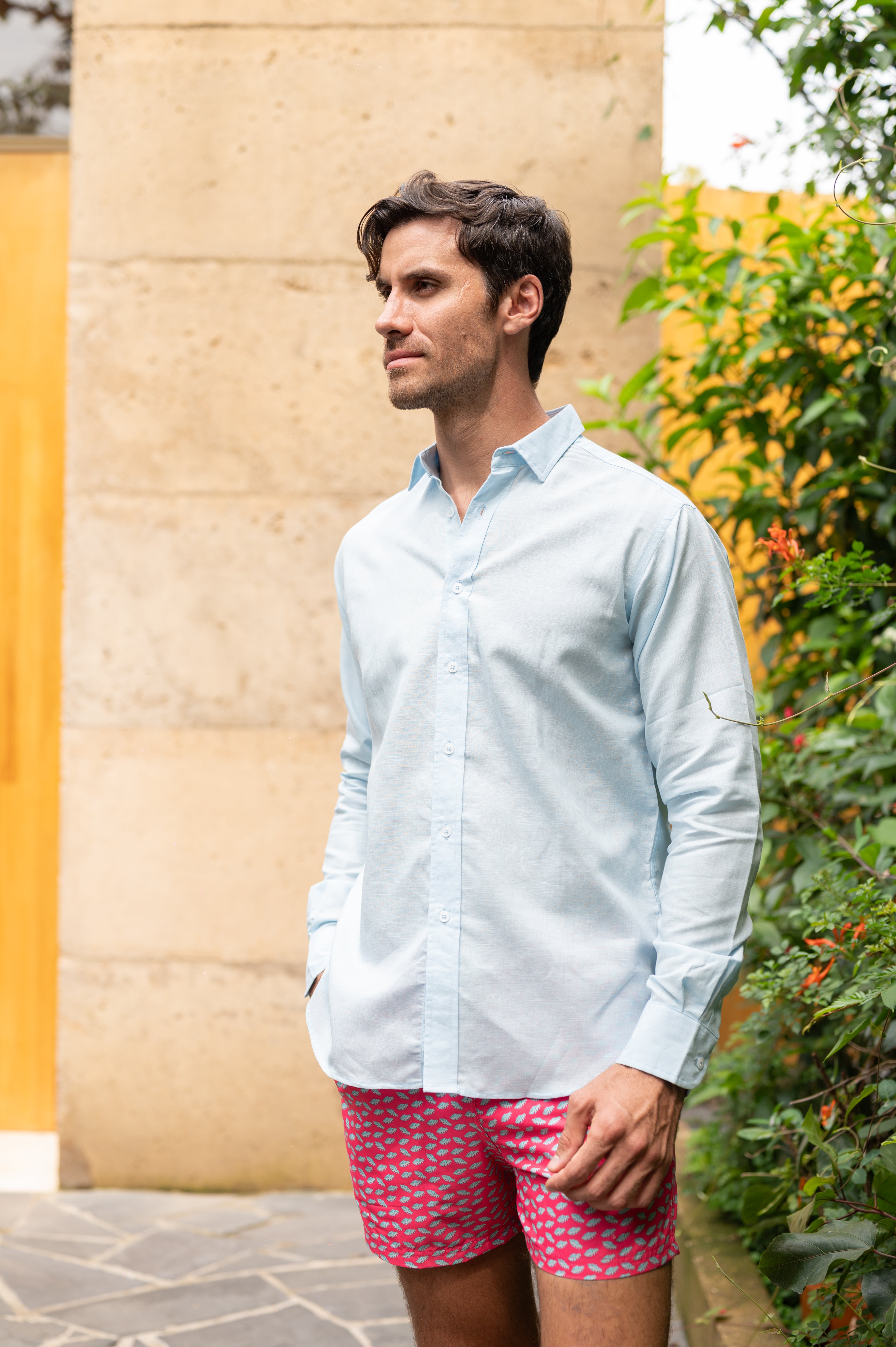 El modelo mide 1.85 y pesa 80 kg. utiliza una camisa talla L. Nuestras camisas de lino son el complemento perfecto: frescas, ligeras y transpirables, ideales para mantener la elegancia en climas cálidos. Confeccionadas con un corte moderno y un tejido de alta calidad, estas camisas ofrecen un look versátil, ideal tanto para momentos casuales como para ocasiones especiales. Turbay trae la armonía perfecta entre lo clásico y lo contemporáneo, brindándote piezas que realzan tu estilo en cada temporada
